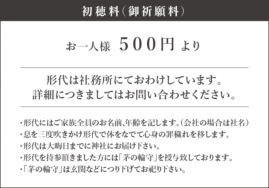六月の大祓を「夏越の大祓」、大晦日の大祓を「年越し大祓」といいます。