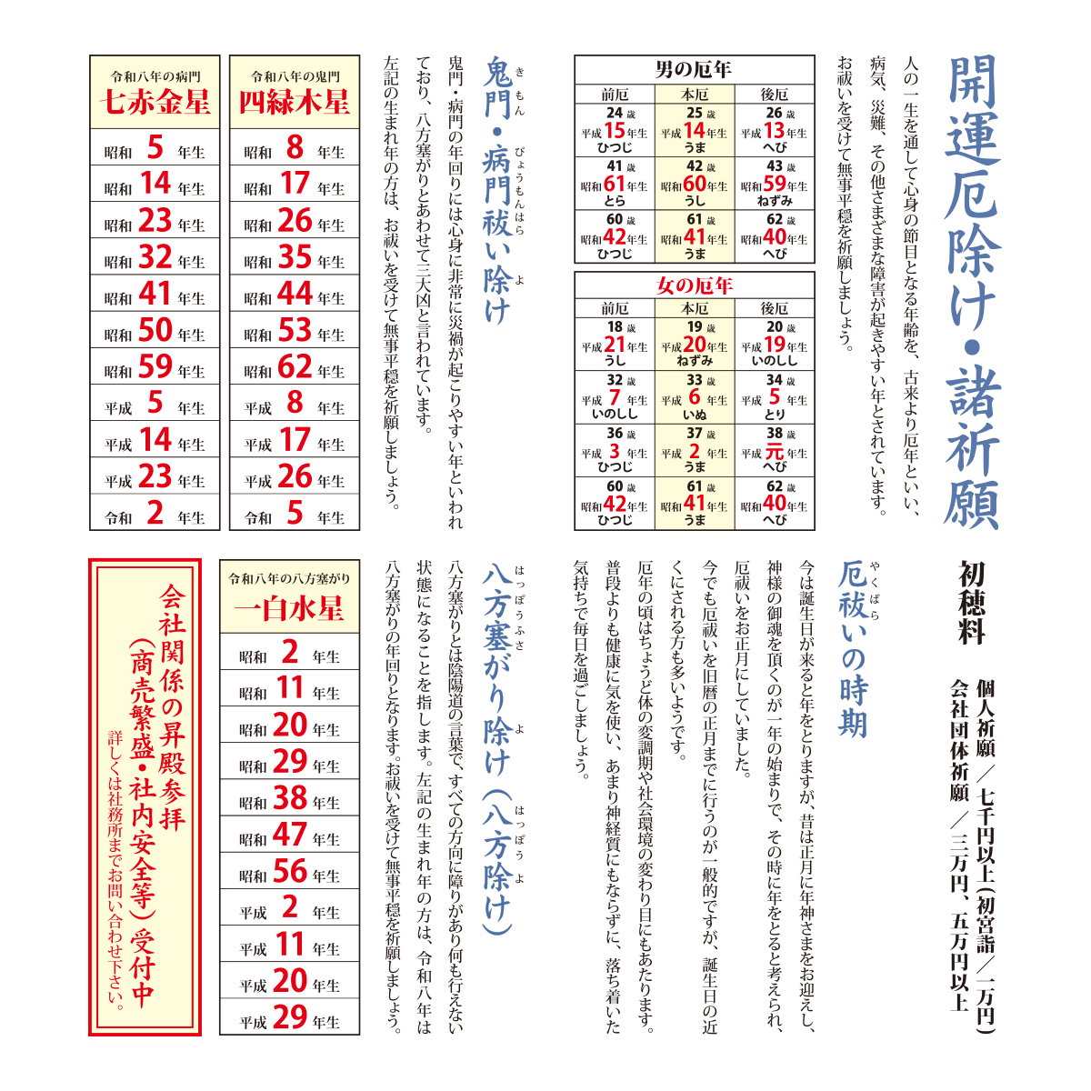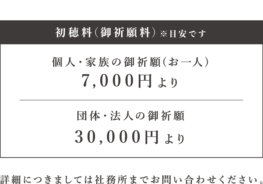 各種厄除け・安全祈願・心願成就祈願・ 初宮詣(お宮参り)・七五三詣・新生児命名など。